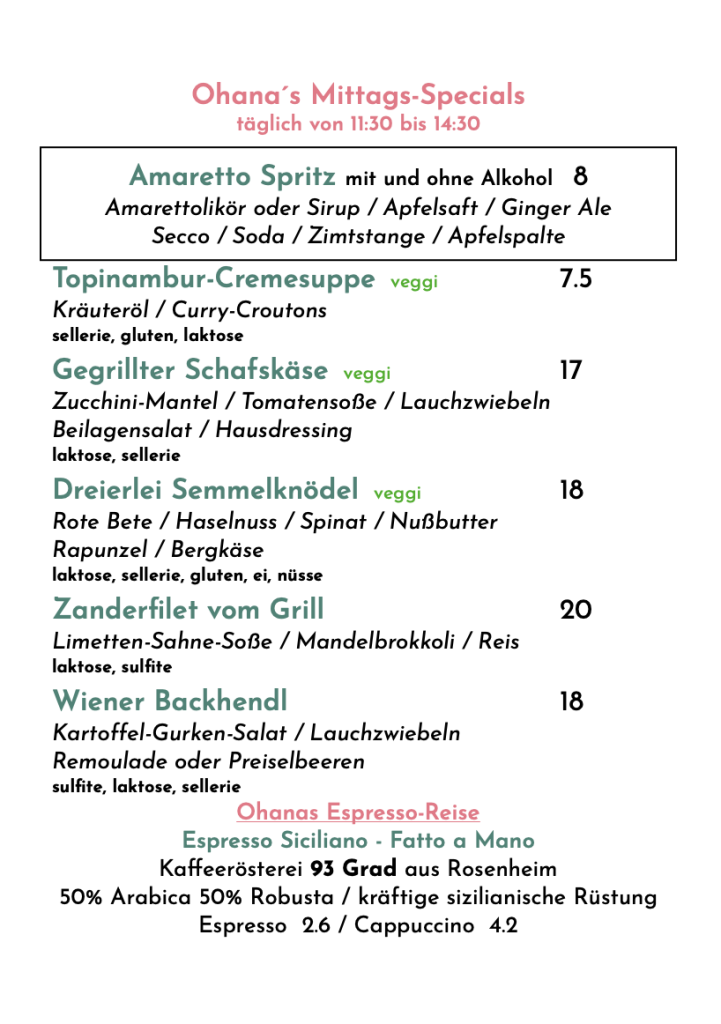 Unsere zusätzliche abwechslungsreiche Mittagskarte von 11:30 bis 14:30 Uhr – ganz im „OHANA“ Style. Mal modern, mal traditionell und immer wieder mal auch individuell.