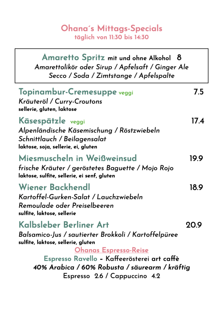 Unsere zusätzliche abwechslungsreiche Mittagskarte von 11:30 bis 14:30 Uhr – ganz im „OHANA“ Style. Mal modern, mal traditionell und immer wieder mal auch individuell.