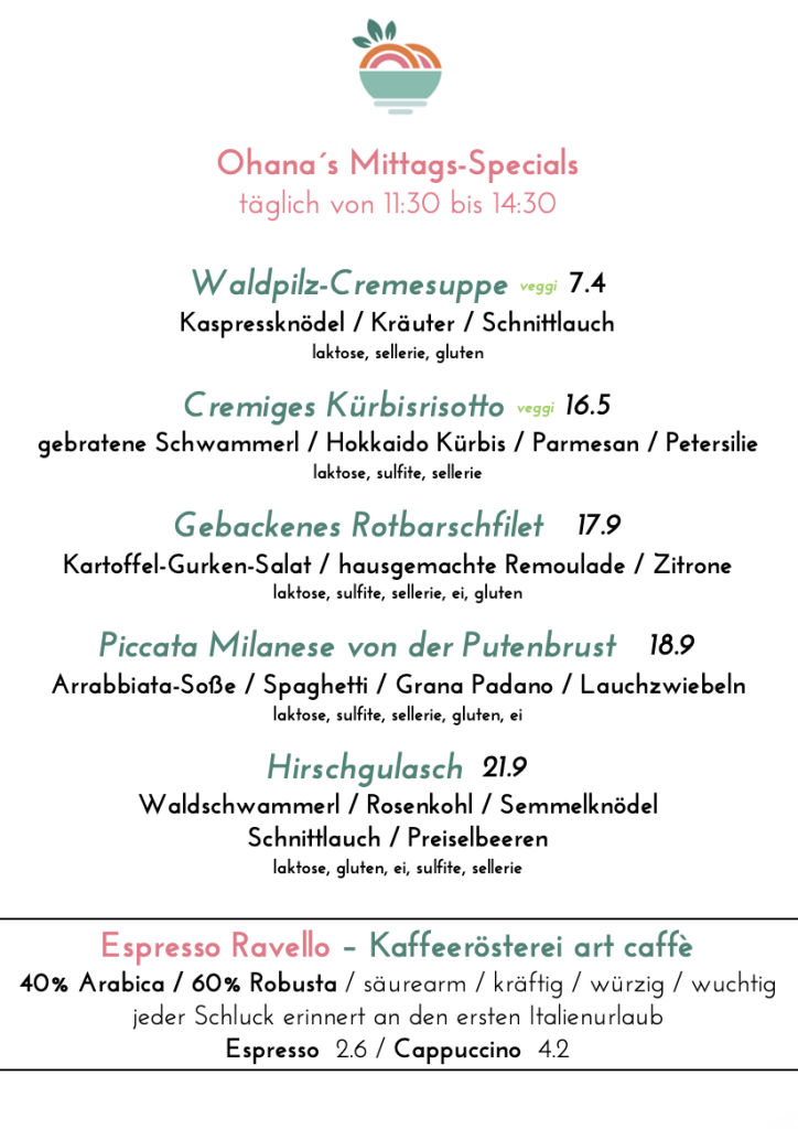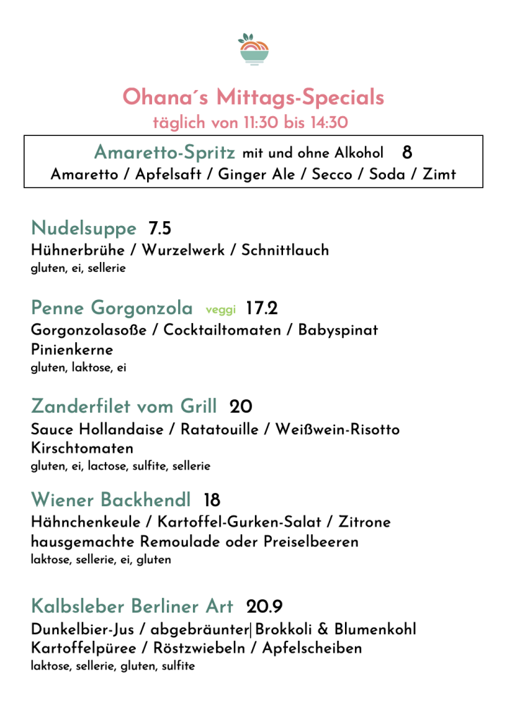 Unsere zusätzliche abwechslungsreiche Mittagskarte von 11:30 bis 14:30 Uhr – ganz im „OHANA“ Style. Mal modern, mal traditionell und immer wieder mal auch individuell.