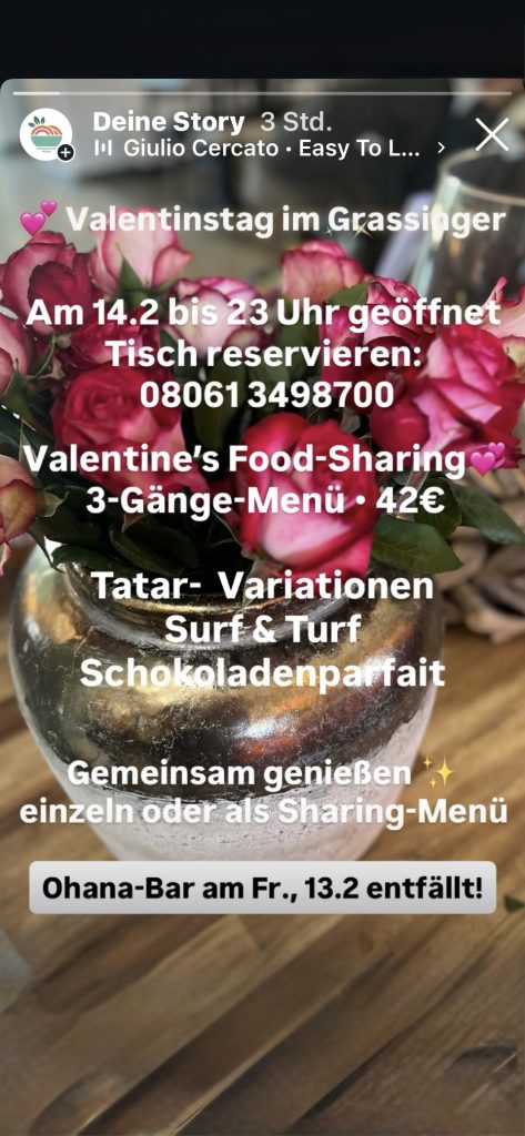 Jeden Freitag – Bar im Grassinger – 17 bis 23 Uhr – 13. Februar keine Bar dafür am Samstag, 14. Februar – Valentinstag von 17 bis 23 Uhr geöffnet. Gerne Tisch reservieren!