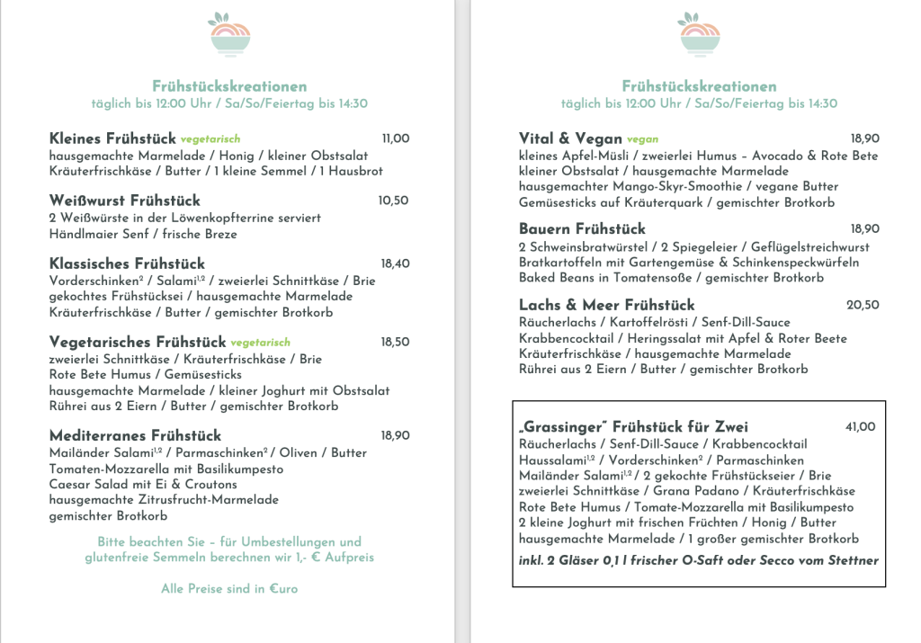 Auszug aus der Frühstückskarte